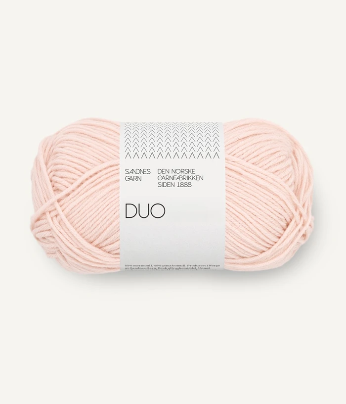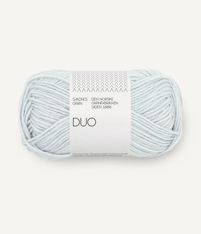 Duo är ett väldigt behagligt helårs garn. Ett bra alternativ till dem som tycker allt sticks. Ullen gör att garnet blir lättare, mer elastiskt och isolerar bättre än ren bomull. Bomull sticks inte. Blandningen av merinoull och bomull gör denna kvalité till ett lätt och mjukt garn som isolerar bra. Ett bra alternativ till dem som tycker att ren ull kliar.
